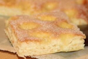 6. Dodaj polewę – Aby przygotować polewę maślaną, równomiernie rozprowadź na cieście małe kostki zimnego masła. Podczas pieczenia masło topi się i rozprowadza po cieście, tworząc cudownie bogaty smak i złotą skórkę. Przed pieczeniem posyp wierzch cukrem i opcjonalnie pokrojonymi migdałami, aby uzyskać charakterystyczną słodką chrupkość.